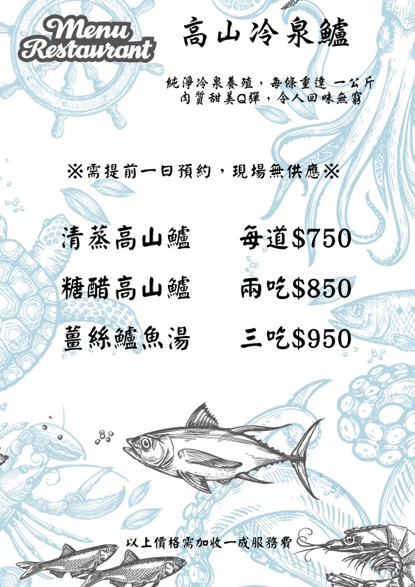 美人鱻境 美人鱻境 (中餐:11:30-14:00 晚餐:17:30-20:00) 美人鱻境 以鱘龍魚及冷泉鱸魚為特色料理,以最新鮮食材及獨特的料理手法,提供套餐及合菜料理,搭配單點特色菜以符合不同客層選擇;另推出主題料理雙人套餐,結合養生餐與泡湯讓人由外而內都健康美麗! 因菜單依季節變換,如需各種價位詳細菜單,歡迎您來電索取。 泉水值 0% 鱘龍魚<肉質> 0% 魚肉口感 0% 菜色精緻度 0% 菜色依季節調整 依現場供應為主 預約餐飲須收取3成訂金,2日內取消恕不退訂